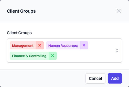After confirming the Client Groups with the `Add` button, the Client Assignment Configuration displays every Group as a seperate box within a Status.