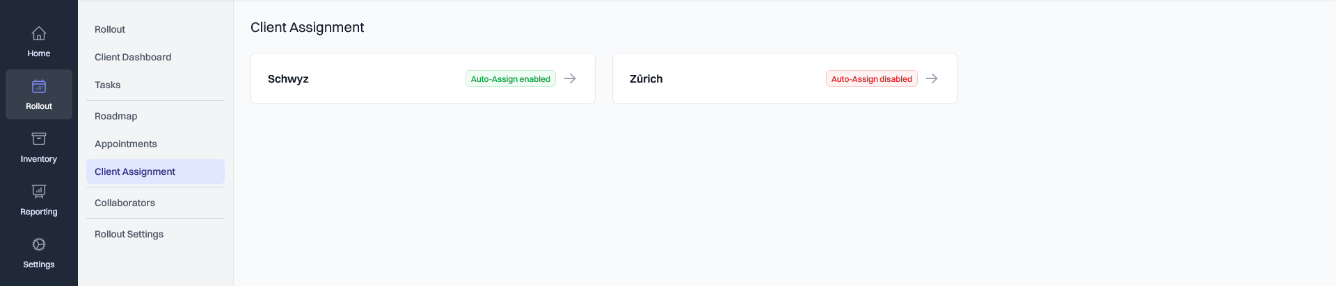 The Client Assignment automatically assigns Technicians to Clients according to a flexible configuration that is based on Status and if needed, on specific [Client Groups](https://rollouter.gitbook.io/guide/rollout-managers/working-with-clients/client-groups) within that Status.