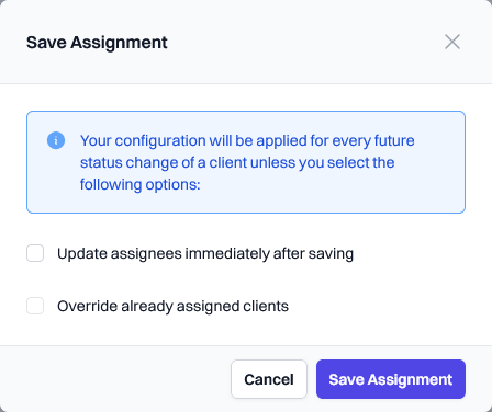 | Update assignees immediately after saving | All Clients **without** Assignee will immediately get assigned according to the Configuration.                                                                                                                                                                                                                                                                 |